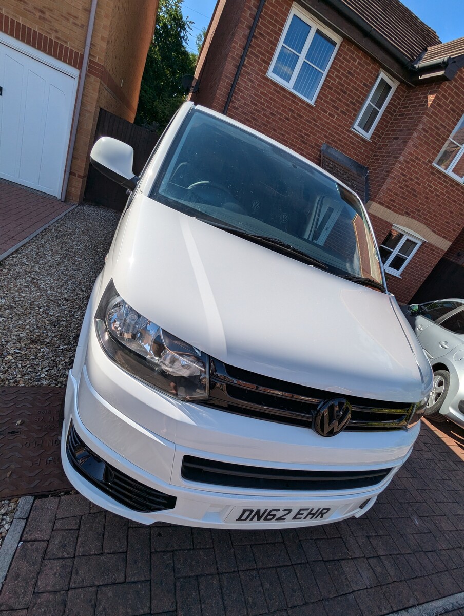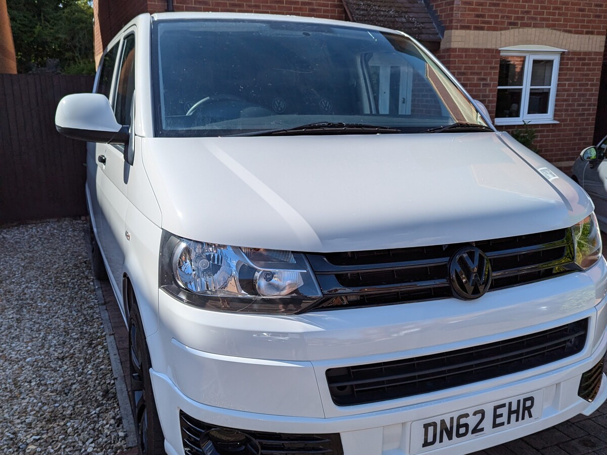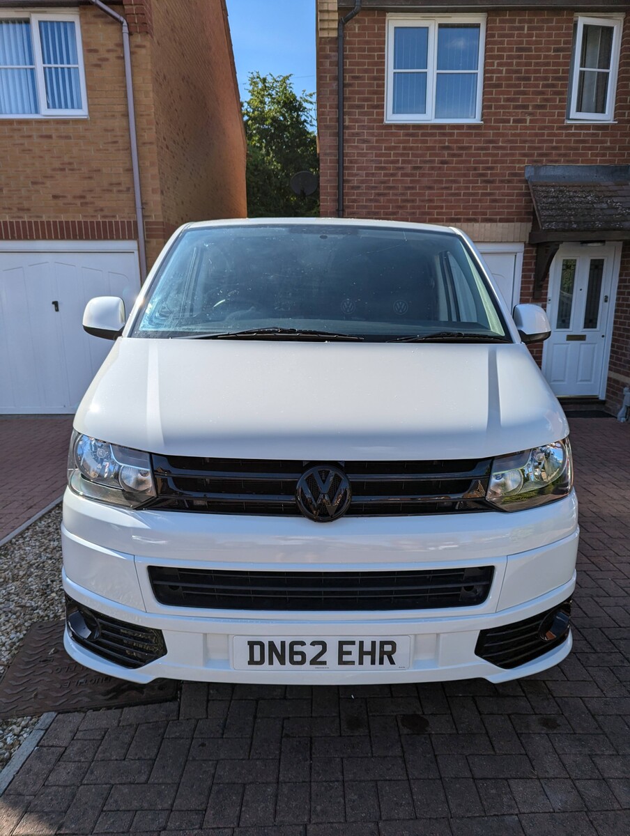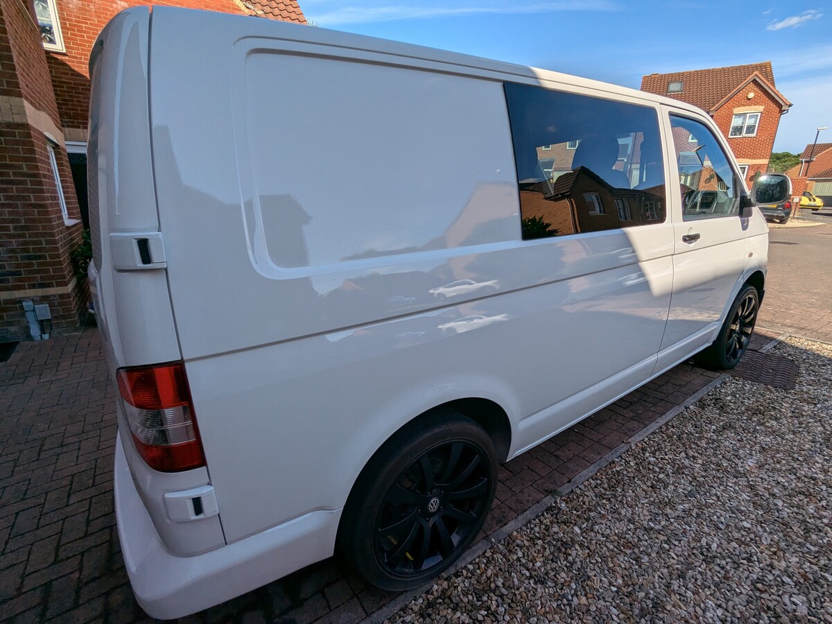 I purchased this VW T5 Transporter at auction after it had been written off. The front end had taken a serious hit — smashed bumper, damaged radiators, damaged grille, bent panels, and broken headlights. The interior was tired and worn from years as a work van and the clutch was completely worn out. With the help of my dad, Jo and I rebuilt it from the ground up into the Storm Trooper — a clean, all-white T5 with a sportline front end, gloss black alloys, quilted leather VW-branded seats, and a fully refreshed interior. We did everything ourselves, from sourcing the parts to the mechanical work (including replacing the clutch) to the bodywork and paint - I learned bodywork and painting.