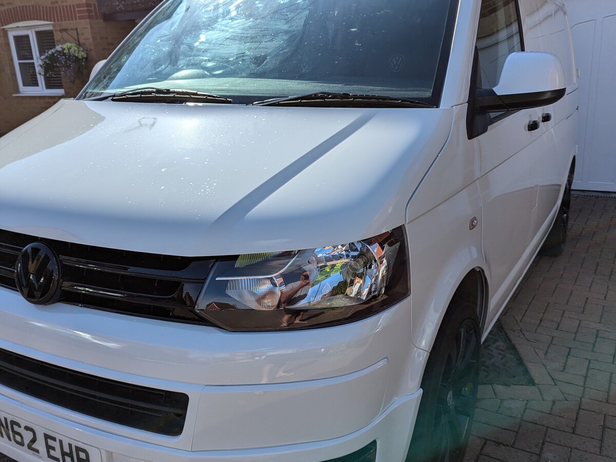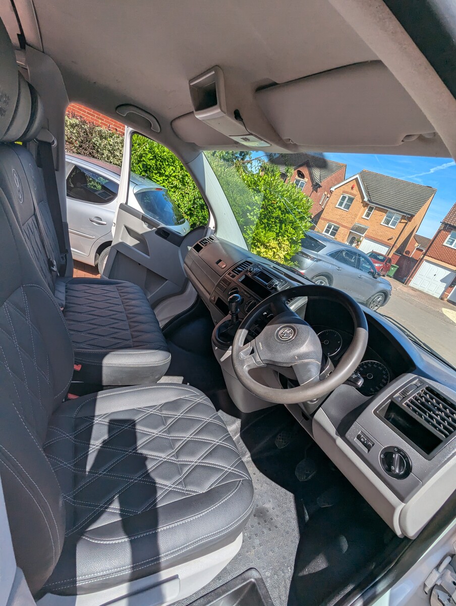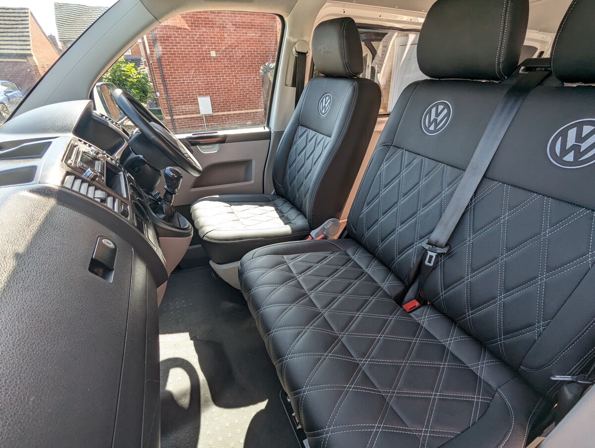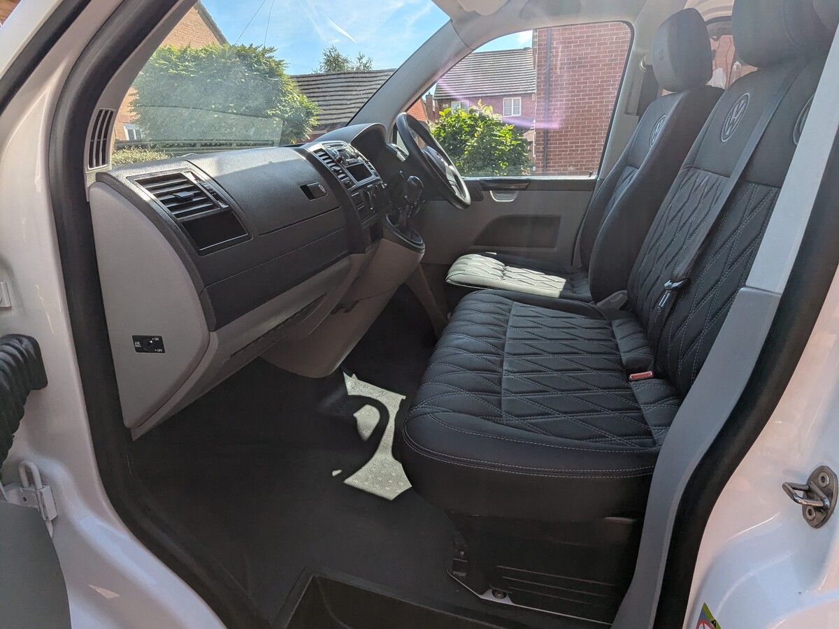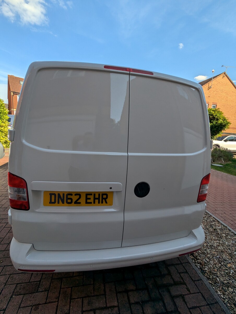 I purchased this VW T5 Transporter at auction after it had been written off. The front end had taken a serious hit — smashed bumper, damaged radiators, damaged grille, bent panels, and broken headlights. The interior was tired and worn from years as a work van and the clutch was completely worn out. With the help of my dad, Jo and I rebuilt it from the ground up into the Storm Trooper — a clean, all-white T5 with a sportline front end, gloss black alloys, quilted leather VW-branded seats, and a fully refreshed interior. We did everything ourselves, from sourcing the parts to the mechanical work (including replacing the clutch) to the bodywork and paint - I learned bodywork and painting.