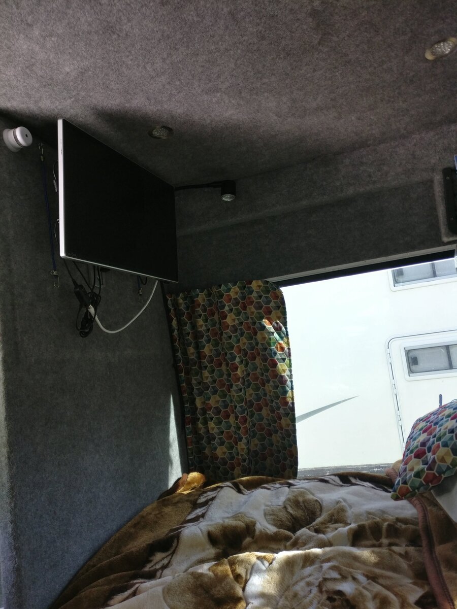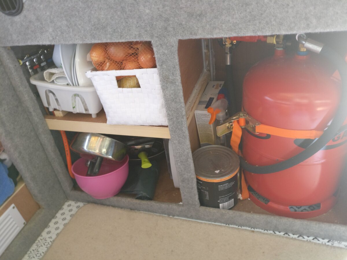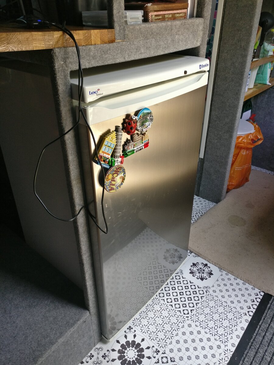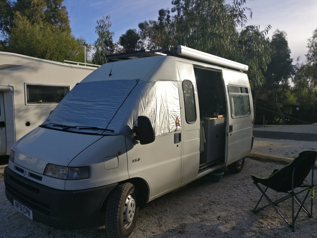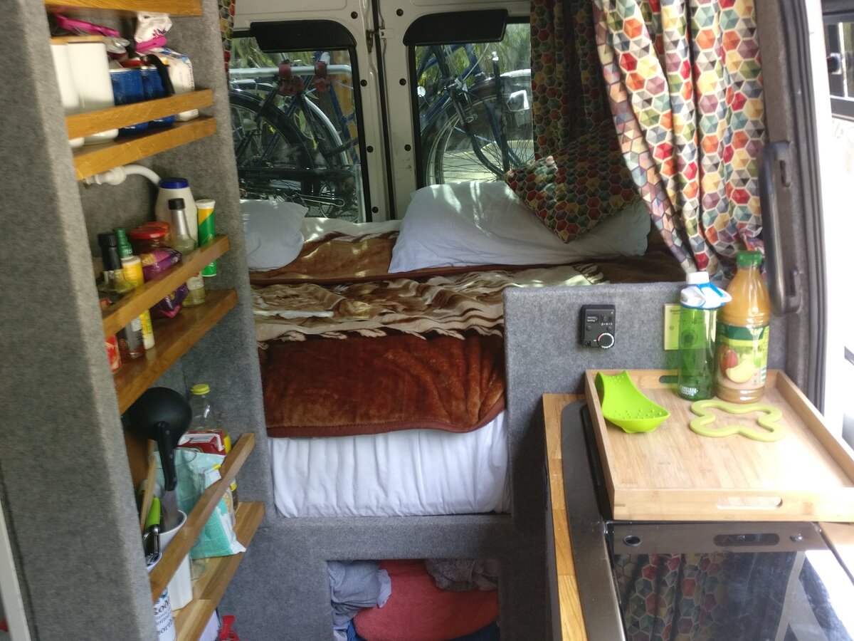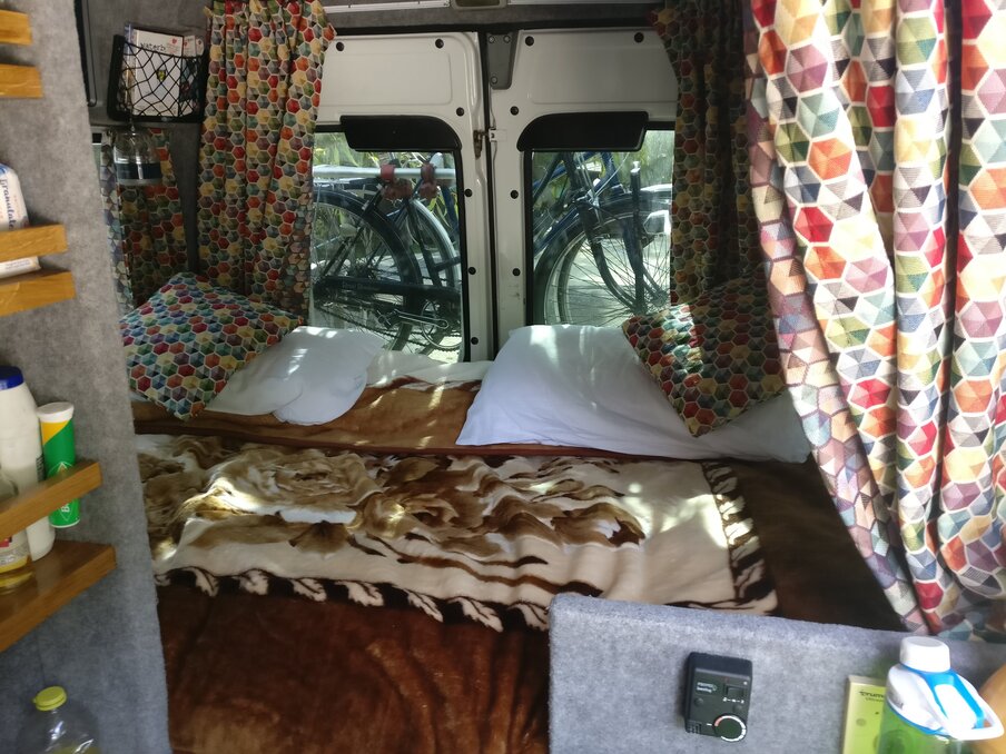 On the outside we fitted an awning, a bike rack, and a roof rack to carry the PV panel. The van was designed to be fully off-grid — we could wild camp for days without needing to hook up to mains power or water.