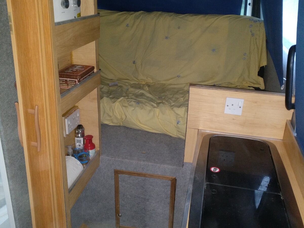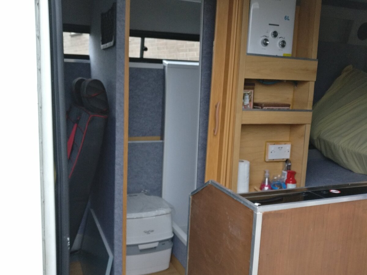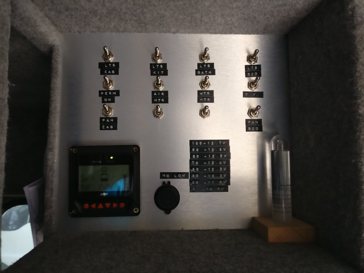 Jo and I bought a partly converted campervan which had previously been an old school bus. The existing conversion was basic and tired, so we stripped it back completely and rebuilt it from scratch to a high standard. We installed captains seats, a full 12V electrical system with a custom switch panel, a gas cooker, gas heater, gas water heater, a solar panel with leisure batteries, a water tank, a TV, handmade curtains, a dedicated workspace, a shower cubicle, carpet throughout, and quality oak finishing throughout.