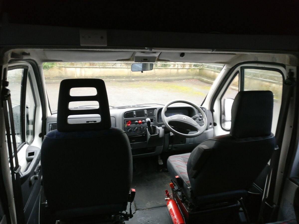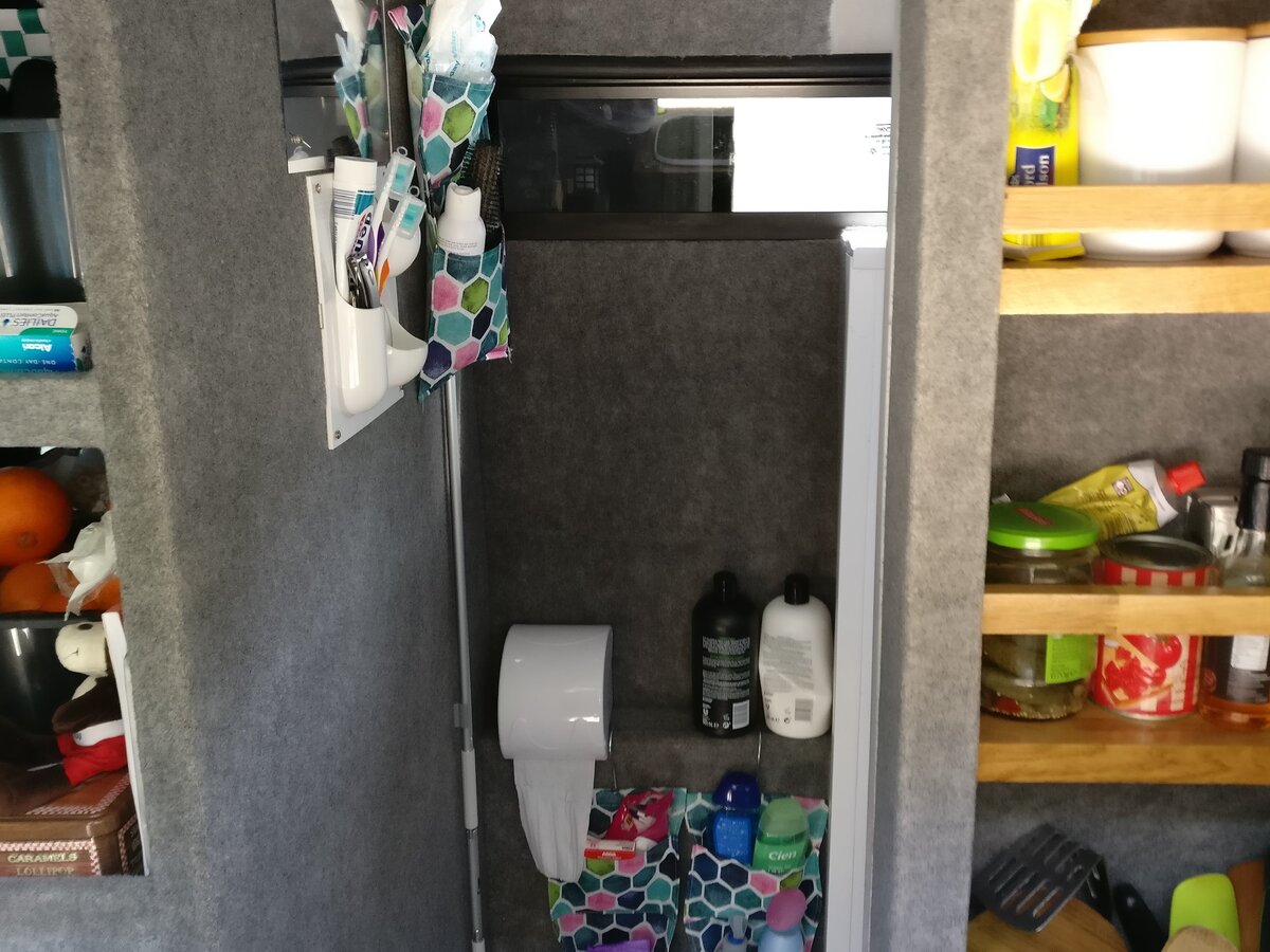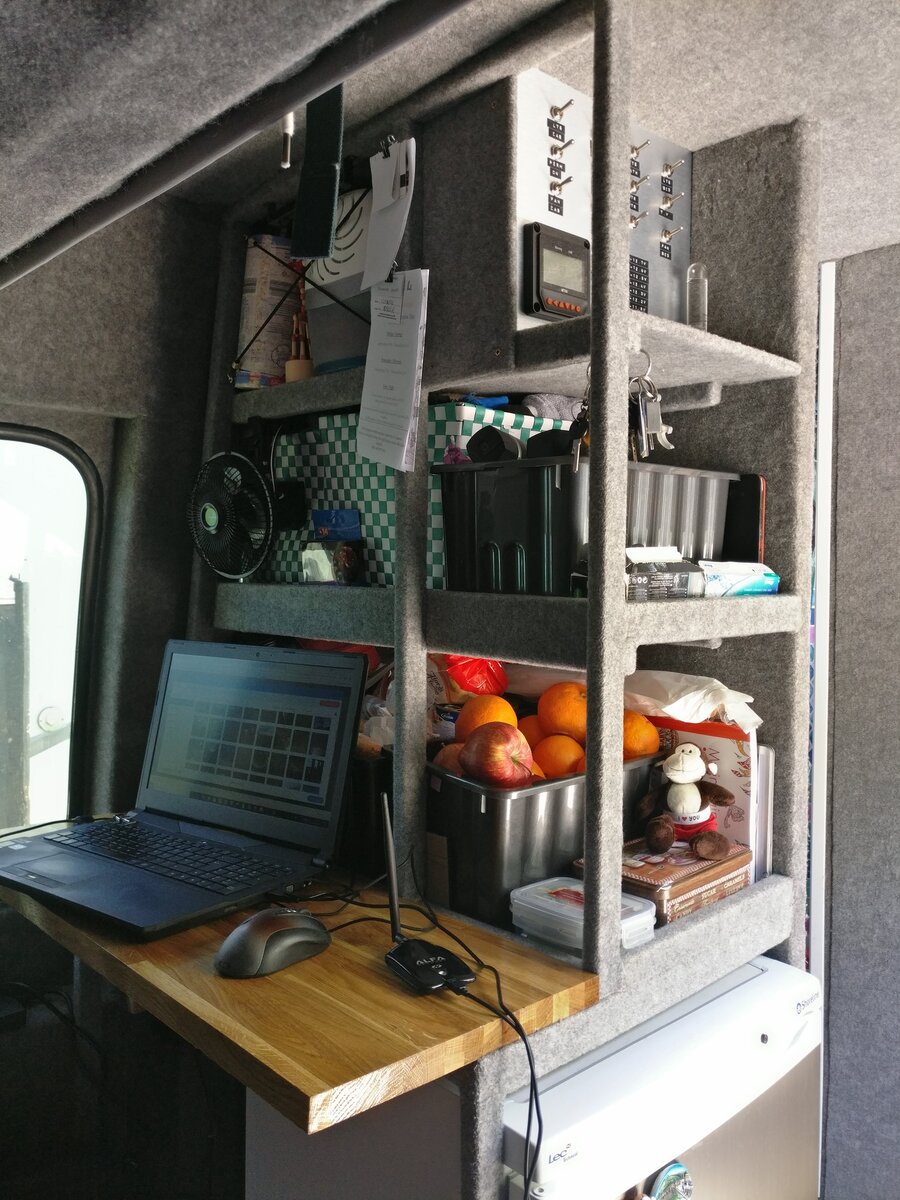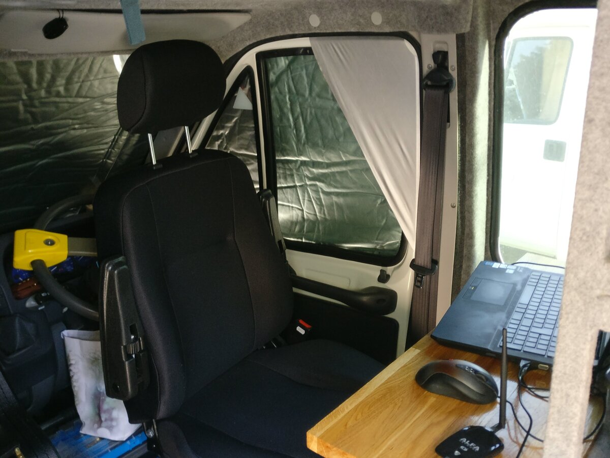 Jo and I bought a partly converted campervan which had previously been an old school bus. The existing conversion was basic and tired, so we stripped it back completely and rebuilt it from scratch to a high standard. We installed captains seats, a full 12V electrical system with a custom switch panel, a gas cooker, gas heater, gas water heater, a solar panel with leisure batteries, a water tank, a TV, handmade curtains, a dedicated workspace, a shower cubicle, carpet throughout, and quality oak finishing throughout.